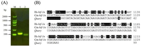 (A) RT-PCR products amplified by different primers. Lane M: DL 2000 DNA marker; Lane 1: the fragment product with primers 18S-F and 18S-R for 18S rRNA as control; Lane 2: the fragment product with primers 1α-F and 1α-R designed to amplify a 96-bp fragment of Cm HIF-1α gene; (B) The actual query nucleotide produced in Lane 2 of (A) above was sequenced. It showed a very high sequence similarity to Cm HIF-1α gene as expected (GenBank accession number JN228344) and a low sequence similarity to Hs HIF-1α in Homo sapiens (GeneID:3091). Nucleotides different from the reference Cm HIF-1α DNA sequence are shaded black.