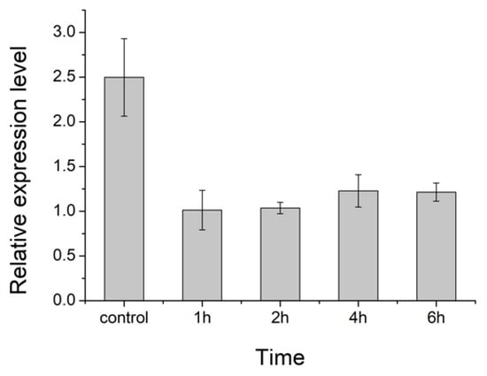 The relative expression level of HIF-1α gene in 4th instar larvae of cowpea weevils under presumably different oxygen levels. Control here denotes the procedure where RNA extraction was immediately performed when live larvae were taken out from the beans. Other treatments are marked by the duration of hours that the live larvae taken out from the beans were further exposed to the ambient air before RNA extraction.