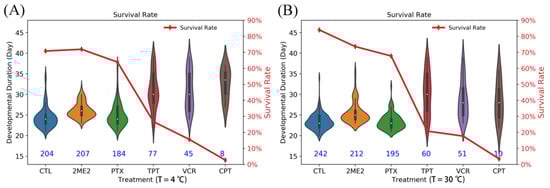 The survival rate and developmental duration of cowpea weevils from the initial egg stage to the final adult stage under two different incubation temperature settings of 4 °C (A) and 30 °C (B). Treatments under five different HIF-1 inhibitors are marked as 2ME2, PTX, TPT, VCR, and CPT. CTL represents the control sample. The five inhibitors are: 2-methoxyoestradiol (2ME2), vincristine (VCR), camptothecin (CPT), topotecan (TPT), and paclitaxel (PTX).