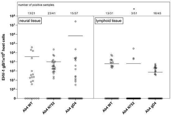 Viral loads (EHV-1 gB genome equivalents/1 × 106 host cells) in neural (left panel) vs. lymphoid (right panel) tissue of EHV-1 infected yearling horses 70 dpi. Horses were infected with either EHV-1 Ab4 WT, Ab4 N752 or Ab4 gD4. Each data point (open circle) represents a tissue sample of an individual horse. An asterisk indicates significant lower affinity compared among and within groups (p < 0.005). The affinity is defined by the number of positive samples in combination with viral loads. Bars represent the mean. Note: data points at the 0-line (x-axis) represent samples where EHV-1 DNA was not detected despite neuronal cells or lymphocytes having been observed microscopically.