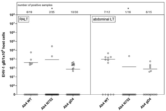 Viral loads (EHV-1 gB genome equivalents/1 × 106 host cells) in respiratory-tract associated lymphoid tissue (RALT, left panel) vs. abdominal lymphoid tissue (abdominal LT, right panel) of EHV-1 infected yearling horses 70 dpi. Horses were infected with either EHV-1 Ab4 WT, Ab4 N752 or Ab4 gD4. Each data point (open circle) represents a tissue sample of an individual horse. An asterisk indicates significant lower affinity compared among groups (p < 0.005). The affinity is defined by the number of positive samples in combination with viral loads. Bars represent the mean. Note: data points at zero-line (x-axis) represent samples where EHV-1 DNA was not detected despite neuronal cells or lymphocytes having been observed microscopically.