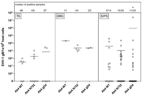 Viral loads (EHV-1 gB genome equivalents/1 × 106 host cells) in trigeminal ganglia (TG, left panel) vs. dorsal root ganglia (DRG, middle panel) vs. sympathetic/parasympathetic ganglia (S/PS, right panel) of EHV-1 infected yearling horses 70 dpi. Horses were infected with either EHV-1 Ab4 WT, Ab4 N752 or Ab4 gD4. Each data point (open circle) represents a tissue sample of an individual horse. An asterisk indicates significant lower affinity compared among groups (p < 0.001). The affinity is defined by the number of positive samples in combination with viral loads. Bars represent the mean. Note: data points at the zero-line (x-axis) represent samples where EHV-1 DNA was not detected despite neuronal cells or lymphocytes having been observed microscopically.