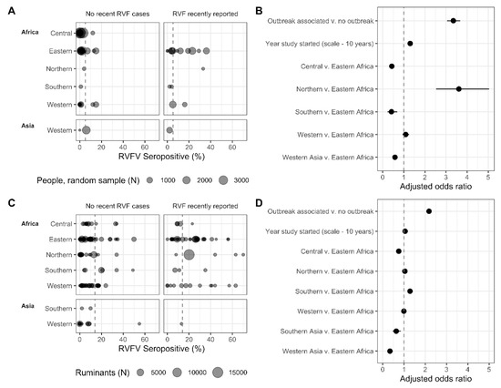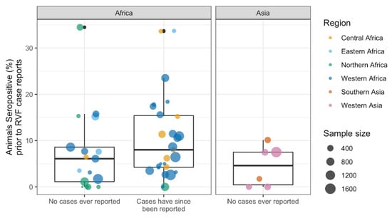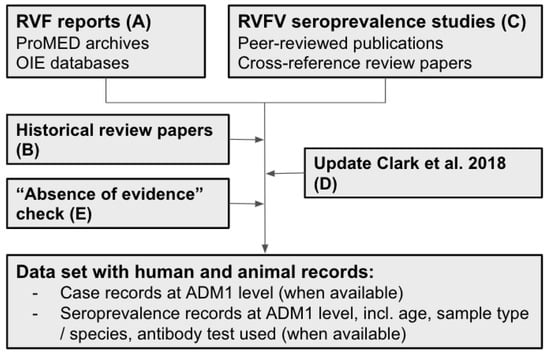 - Clark, M.H.A.; Warimwe, G.M.; Di Nardo, A.; Lyons, N.A.; Gubbins, S. Systematic Literature Review of Rift Valley Fever Virus Seroprevalence in Livestock, Wildlife and Humans in Africa from 1968 to 2016. PLoS Negl. Trop. Dis. 2018, 12, e0006627. [Google Scholar] [CrossRef]
