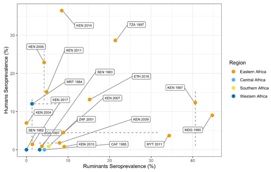 3.4.2. Correlation between Animal and Human Seroprevalence