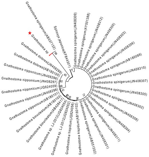 Xiphinema americanum (AM086690, KF748494) was used to root the phylogenetic trees of Eustrongylides sp. [34], while Spiroxys japonica (KF530325, KF530321) was used as an outgroup in Gnathostoma sp. phylogenetic trees [47,48]. Statistical support for taxa grouping was estimated using bootstrap analysis (1000 replicates).