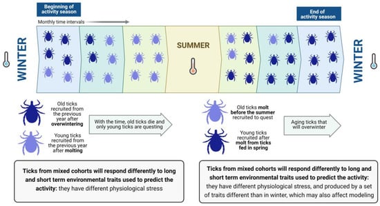 Two or more cohorts of ticks may co-exist in the field [3] but this is not a rule for every species of tick. Ticks of similar physiological age may occur in sites with a strict weather seasonality that “resets” tick metabolic activity and separates the different periods of molting and activity. However, for populations of ticks that show long-lasting activity (i.e., continuous vitality throughout one complete year), cohorts of ticks of different physiological ages could coexist and quest together [4]. Therefore, “old” and “young” ticks overlap in space and time (Figure 1).