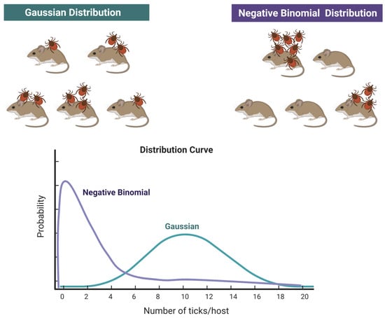 The scheme shows a Gaussian-type distribution of a species of tick on a population of hosts, with every host carrying ticks and a variable number of ticks on each host, and a negative binomial distribution, showing how most ticks are concentrated on a few hosts, while most hosts do not carry ticks at all. Both distributions are displayed as a chart. Mean number of ticks and standard deviation are the same for both distributions. Created with BioRender.com.