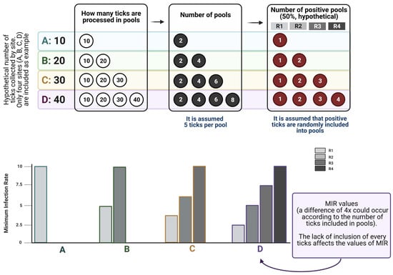 The effect of tick sampling on hosts on the determination of the Minimum Infection Rate (MIR) of a hypothetical pathogen. In table A we introduce four hypothetical host specimens (A, B, C, D) that carry 10, 20, 30 or 40 ticks. Of these hosts, researchers can retrieve all or a fraction of these ticks (indicated in the columns) and pools are prepared assuming a fixed number of 5 ticks per pool. We also assumed a fixed positivity rate of 50% under every condition, and made assumptions about the ways the calculation of MIR is affected by these factors. The chart shows the values of MIR obtained from hosts A, B, C or D based on the number of positive pools. It can be observed that values can change from MIR = 2.5 to MIR = 10 according to the number of ticks collected, assuming the same infection rate. The conclusion is two-fold: even if researchers consider MIR from ticks collected while feeding to be reliable (which it is not), it is deeply affected by the number of ticks collected. Created with BioRender.com.