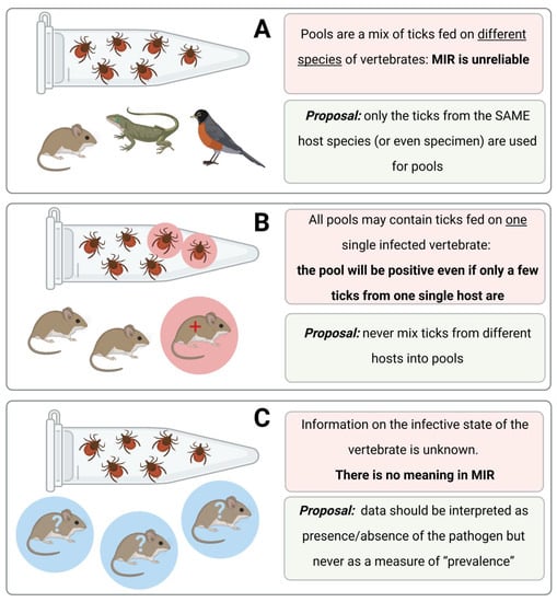 The inaccuracies commonly reported when estimating the Minimum Infection Rate (MIR) of a pathogen detected in ticks collected while feeding. In (A), ticks are collected from different species of hosts and pooled together. We believe that unreliable conclusions would be drawn from these data, since there is no way to determine which host (if any) contributed to the presence of pathogen-derived DNA in the feeding ticks. In (B), ticks are collected from the same species of host, but only one host is contributing to the presence of the pathogen; pools contain material from different individuals. If pools are random, ticks coming from the only positive host could “contaminate” every sample giving an overestimate of the infection rate in ticks. In (C), the most commonly reported situation, the infection status of vertebrates is not recorded. We recommend not to use MIR values based on collections of feeding ticks. These data may demonstrate the presence of a pathogen in a site but should never be used in a quantitative way. Created with BioRender.com.