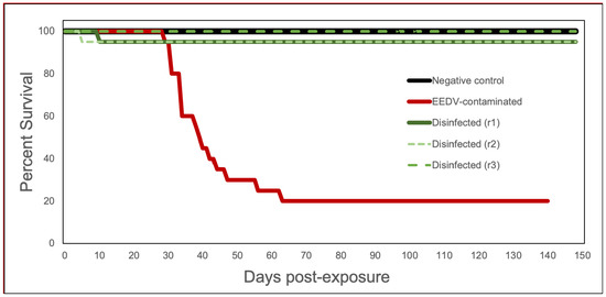 Cumulative percent mortality (CPM) of the treatment groups (i.e., negative control, EEDV-contaminated, disinfected) was analyzed by one-way ANOVA. Pairwise comparisons were made using the Tukey–Kramer test. All analyses were conducted in Microsoft Excel [25], and α was set at 0.05.