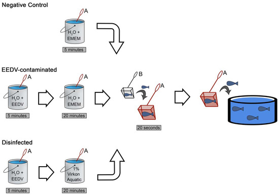 All challenges began with specific treatments of NetA (detailed below; Figure 2). After NetA treatments were completed, a second net (NetB) was used to transfer all 20 fish from their experimental tank into NetA, where they were held for 20 s and then transferred immediately back to their flow-through experimental tank. All treatments and replicates utilized separate nets and fresh batches of EMEM and disinfectant solutions. A single EEDV solution was used for all “contamination” steps. The NetA treatments for the three treatment groups were as follows (Figure 2):