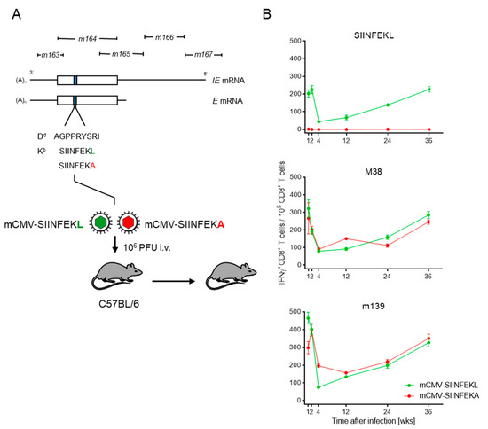 In the specific case, we integrated the antigenic peptide SIINFEKL or its non-antigenic peptide analog SIINFEKA into the non-essential protein m164 in place of the known MI-driving, Dd-presented antigenic peptide AGPPRYSRI ([21] and references therein). In latency, the peptides can be stochastically expressed from the authentic E-phase transcript, as well as from an IE-phase transcript initiating at an upstream promoter ([48,49], and references therein) (Figure 1A).