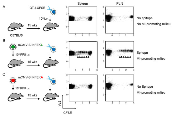 Verification of antigen presentation in latently infected C57BL/6 recipients of OT-I cell transfer. Fluorescence-labeled OT-I cells (2x107 per mouse) were transferred intravenously (i.v) into C57Bl/6 mice as recipients. At 60 h after transfer, CD8+ T cells were recovered from the spleen and popliteal lymph nodes (PLN) of 5 mice per group, and proliferation of fluorescence-labeled TCR-Vα2+ OT-I cells was assessed by loss of the fluorescent marker with every cell division (arrows). Transfer recipients were: (A) Uninfected C57BL/6 mice; (B) C57BL/6 mice latently infected with mCMV-SIINFEKL, and (C) C57BL/6 mice latently infected with mCMV-SIINFEKA.