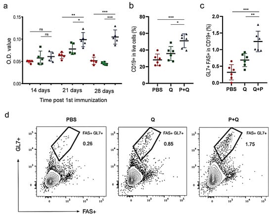 Humoral immune responses against SARS-CoV-2 S proteins. (a) Comparison of humoral responses among groups of mice injected with PBS (marked in red), QuickAntibody (in green) and Peptide + QuickAntibody (in blue), respectively. The level of total IgG was measured by ELISA. (b) The percentages of B-cells (CD19+ cells) in live cells. (c) The percentages of GC cells (FAS+GL7+ cells) in CD19+ cells. (d) Flow cytometry showing the larger percentage of FAS+/GL7+ cells in the peptide-treated mice. PBS, Q, P+Q represent mice injected with PBS, mice with QuickAntibody and mice with peptide vaccines plus QuickAntibody, respectively. * p < 0.05; ** p < 0.01; *** p < 0.001; ns: not significant.