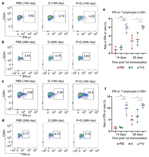 SARS-CoV-2 S protein-specific T-cell activation through peptide vaccination. (a,b) show the IFN-γ-secreting T lymphocytes in CD4+ cells on the 14th and the 28th day after the 1st immunization, respectively. (c,d) show the IFN-γ-secreting T lymphocytes in CD8+ cells on the 14th and the 28th day after the 1st immunization, respectively. (e,f) show the percentage of IFN-γ-secreting cells in CD4+ cells and CD8+ cells, respectively. PBS, G and P + G represent mice injected with PBS, GM-CSF and peptide vaccines plus GM-CSF, respectively. * p < 0.05; ** p < 0.01; *** p < 0.001.
