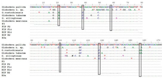 Although the 221 pb fragment was conserved among G. pallida accessions, the specificity of all primers designed by the online tool was also manually checked. The aim was to have two out of the three primers F and two out of the three primers B having the nucleotide of the last position at the 3′ end mismatching in all of the non-target species (vertical boxes in Figure 2).
