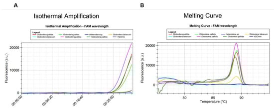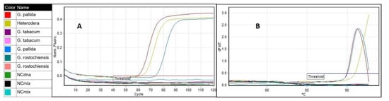 Specificity test of the LAMP assay using genomic DNA from Globodera pallida, G. tabacum and Heterodera sp.: (A) amplification curves and (B) derivative of the melting temperature curve.