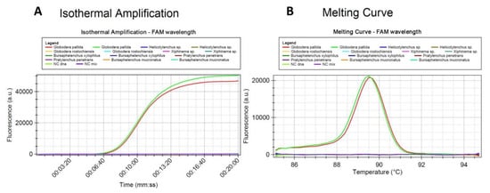 Specificity test of the LAMP assay using genomic DNA from Globodera pallida, Pratylenchus penetrans, Xiphinema sp., Helicotylenchus sp., Bursaphelencus (B. xylophilus and B. mucronatus): (A) amplification curves and (B) derivative of the melting temperature curve.