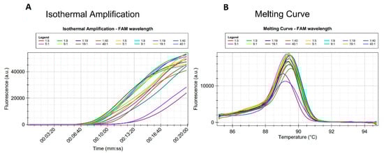 Diagnostic sensitivity test of the LAMP assay performed in the Laboratory of Nematology in Évora. (A) Isothermal amplification and (B) Melting curve. Amplification of DNA extracts from pools having different proportions of G. rostochiensis: G. pallida J2.