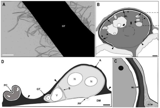 - O’Connell, R.J.; Pain, N.A.; Hutchison, K.A.; Jones, G.L.; Green, J.R. Ultrastructure and composition of the cell surfaces of infection structures formed by the fungal plant pathogen Colletotrichum lindemuthianum. J. Microsc. 1996, 181, 204–212. [Google Scholar] [CrossRef]