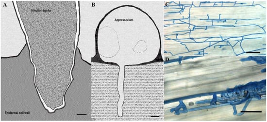 - Mendgen, K.; Hahn, M.; Deising, H. Morphogenesis and mechanisms of penetration by plant pathogenic fungi. Annu. Rev. Phytopathol. 1996, 34, 367–386. [Google Scholar] [CrossRef]