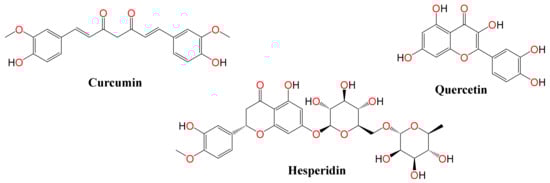 Chemical structures of the tested compounds (curcumin, quercetin, and hesperidin).