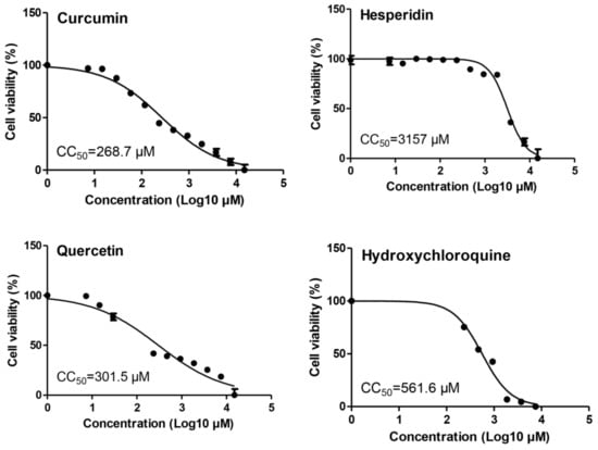 Cytotoxicity assay of the tested compounds in Vero E6 cells. The cytotoxicity of curcumin, hesperidin, quercetin, and hydroxychloroquine based on the dose–response was determined using MTT. The 50% cytotoxic concentration (CC50) was calculated for each compound using nonlinear regression analysis of GraphPad Prism software (version 5.01).