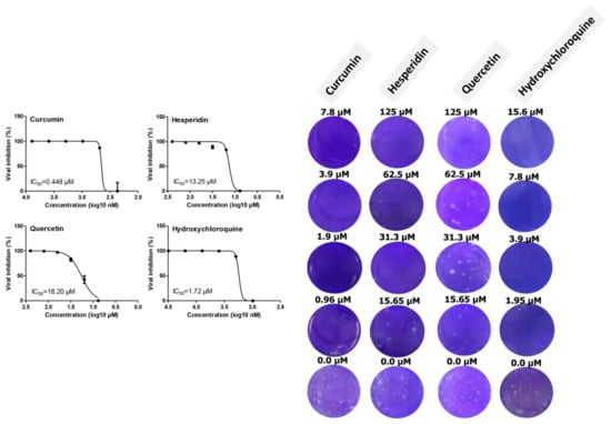 Antiviral activity of curcumin, hesperidin, quercetin, and hydroxychloroquine using a plaque reduction assay against SARS-CoV-2 virus in Vero E6 cells. Inhibitory concentration 50% (IC50) values were calculated using nonlinear regression analysis of GraphPad Prism software (version 5.01) by plotting log inhibitor versus normalized response (variable slope).