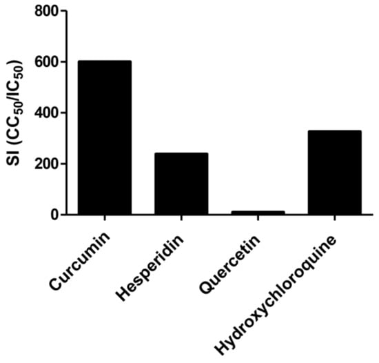Consequently, the selectivity indexes (SI = CC50/IC50) of curcumin, hesperidin, quercetin, and hydroxychloroquine compounds showed 600, 238, 17, and 326, respectively (Figure 4).