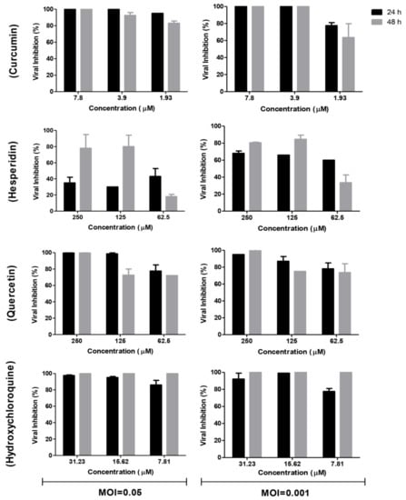Vero E6 cells were infected at MOIs of 0.05 and 0.001 of the virus then treated with curcumin (7.8, 3.9, and 1.93 µM), hesperidin (250, 125, and 62.5 µM), quercetin (250, 125, and 62.5 µM), and hydroxychloroquine (31.23, 15.6, and 7.8 µM), respectively. The cells were incubated for 24 and 48 h post-infection at 37 °C in 5% CO2 in infection medium. Mock-infected cells without treatment in the same plate were used as control. Cell culture supernatants were collected at each point of the time course infection in order to perform viral quantification by plaque infectivity assay and RT-qPCR [48]. Percentage of viral reduction in plaques counts and viral RNA copy numbers in comparison to control wells was recorded as follows: