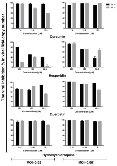 Time course analysis of antiviral effects of curcumin, hesperidin, and quercetin comparing with hydroxychloroquine based on viral RNA copy number. Vero E6 cells were infected at MOI of 0.05 and 0.001 of SARS-CoV-2 then treated with curcumin (7.8, 3.9, and 1.93 µM), hesperidin (250, 125, and 62.5 µM), quercetin (250, 125, and 62.5 µM), and hydroxychloroquine (31.23, 15.6, and 7.8 µM). The cells were incubated for 24 h and 48 h post-infection followed by detecting the viral RNA for treated/infected and untreated/infected samples using real-time RT-PCR. The relative copy number of viral RNA inhibition (%) was normalized to the virus-untreated control.