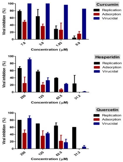 Percent inhibition for various mode of actions are shown in Figure 7. Interestingly, curcumin had a combination of viral inhibitory effect on SARS-CoV-2 at different viral stages. Curcumin has >99% virucidal effect indicating that it possibly acts directly on the virion causing inactivation. Additionally, it showed 76% and 45% inhibitory effect at 7.8 µM concentration during viral replication and adsorption stages, respectively. At a lower dose, curcumin’s virucidal effect had the most effective action compared with replication and adsorption mechanisms. Hesperidin exhibited the virucidal effect with more than a 90% viral inhibitory effect as well as an approximately 65% inhibitory effect on virus replication. A negligible reduction in viral inhibition was detected during the application of a viral adsorption mechanism. Quercetin showed virucidal effects on the virus as well as effects on viral replication.