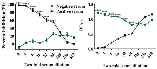 Analytical sensitivity of p30-based bELISA. Two-fold serial dilutions of the high-positive and negative control serum were tested in bELISA. Each data point is shown as the mean value of two repeats, and the error bar represents the standard deviation. Asterisks indicate dilutions at which the PI and OD410 of the positive control serum were statistically different from those of negative control serum. **** p < 0.0001.
