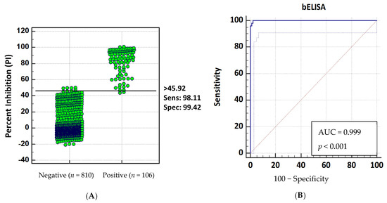 Two sets of serum samples with known antibody status were used to evaluate the diagnostic sensitivity and specificity of the p30-based bELISA. The anti-p30 antibody-positive population consisted of 106 serum samples, including 24 samples collected from pigs infected with ASFV-attenuated OURT 88/3 strain or Georgia/07 strain and 82 samples collected from pigs immunized with recombinant alphavirus or adenovirus particles expressing p30. The anti-p30 antibody-negative population contained 810 serum samples from known ASFV-negative pigs, including 300 samples from Iowa State Veterinary Diagnostic Laboratory (ISU VDL) and 510 samples from experimental pigs in the US. Before testing in bELISA, all samples were analyzed by IFA to confirm the antibody status. The ROC analysis of the bELISA data showed that the cutoff value of 45.92 percent inhibition (PI) produced an optimal diagnostic sensitivity of 98.11% (95% confidence interval of 93.4% to 99.8%) and diagnostic specificity of 99.42% (95% confidence interval of 98.7% to 99.8%.) (Figure 4A). The assay performance was evaluated using a single-graph ROC plot, which was calculated by comparing false-positive results (1 − diagnostic specificity) and true-positive results (diagnostic sensitivity). The area under the curve (AUC) represents the overall accuracy of the assay. An AUC of 1 represents a perfect test, and an AUC above 0.9 indicates high accuracy of the assay. As shown in Figure 4B, the AUC of p30-based bELISA was 0.999 (p < 0.001) with a 95% confidence interval of 98.3–100%, demonstrating the high accuracy of the assay.