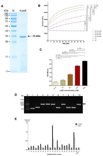 Preparation of native LasB (nLasB) and selection of the LasB-bound HuscFv-displaying phage clones. (A) Purified nLasB revealed by SDS-PAGE and CBB staining. M, protein molecular mass marker (ThermoFisher Scientific, Rockford, lL, USA); nLasB, purified native LasB (~33 kDa, arrow). Numbers at the left are protein masses in kDa. (B) Determination of enzymatic activities of the purified nLasB using fluorogenic substrate assay. PC, positive control which was porcine pancreatic elastase (0.025 U/mL) mixed with substrate; NC, negative control which was reaction buffer mixed with substrate; ACTIVITY (RFU), relative fluorescence units of the enzymatic activity per minute. (C) Results of elastin-Congo Red assay for determining elastolytic activity of the nLasB. NS, not significantly different. (D) Colony-PCR analysis of representative phage-transformed HB2151 E. coli clones; black arrow indicates amplicon of complete huscfvs (1000 bp) in the phage-transformed-E. coli. Smaller DNA bands are truncated huscfvs. M, DNA marker (Thermo Fisher Scientific); 1-10, the phage-transformed E. coli clones nos. 1-10, respectively. Numbers at the left are DNA masses in base pairs (bp). (E) Results of indirect ELISA for determining the binding of HuscFvs in lysates of phage-transformed HB2151 E. coli clones to nLasB, control BSA (antigen control), and HB2151 (lysate of original HB2151 E. coli without huscfv-phagemid) as background binding control; asterisks indicate the clones that their HuscFvs gave the high binding activity to nLasB (an ELISA signal at OD 405 nm to the nLasB: OD 405 nm to the control BSA was more than 2). These clones were selected for further experiments.