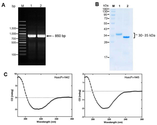After subcloning of the huscfvs of the E. coli clones N42 and N45 from recombinant pCANTAB-5E phagemids into the pLATE52 plasmids, the PCR products showed the bands at the expected size of around 850 bp (Figure 2A). The LasB-bound HuscFvs with the 6× His tag at the N-terminal and E-tag at the C-terminal were expressed from the huscfv-plasmid transformed NiCo21(DE3) E. coli under IPTG induction. Figure 2B shows SDS-PAGE-separated- and CBB-stained LasB-bound HuscFvs (~30, 35 kDa) after purification and refolding from the inclusion bodies of the N42 and N45 E. coli clones. From the program analysis of the CD spectra (Figure 2C), the refolded HuscFv-N42 and HuscFv-N45 were found to acquire mainly β-sheet structure, which is the characteristic of immunoglobulin molecule. Moreover, the refolded HuscFvs retained the nLasB binding ability, as demonstrated by indirect ELISA (Supplementary Figure S1), indicating correct folding of the antibody molecules.