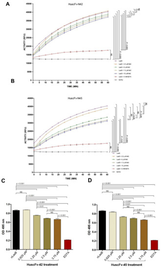 The fluorogenic substrate assay was used to determine the neutralizing activity of the HuscFvs on the LasB elastolytic activity. The percentages of relative fluorescence units emitted from the DO-elastin substrate after the enzyme was treated with different concentrations of HuscFvs and controls are shown in Figure 3A,B. The fluorescence intensity of nLasB treated with HuscFv-N42 showed decreasing trend as the antibody concentrations increased, albeit not significantly different from the nLasB alone (without HuscFvs). The nLasB treated with the HuscFv-N45 had significantly decreased enzymatic activity as the HuscFv concentrations increased. The results of this assay indicate that the HuscFvs neutralized the nLasB enzymatic activity in a dose-dependent manner. In this experiment, the 5 mM EDTA which was used as positive LasB elastase neutralization control, effectively neutralized (abolished) the enzymatic activity.