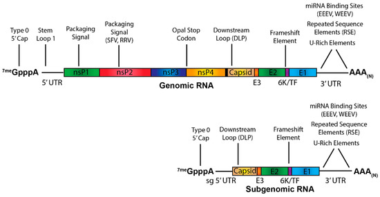 - Lapointe, A.T.; Landers, V.D.; Westcott, C.E.; Sokoloski, K.J. Production of Noncapped Genomic RNAs Is Critical to Sindbis Virus Disease and Pathogenicity. mBio 2020, 11. [Google Scholar] [CrossRef] [PubMed]