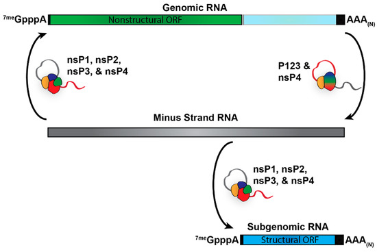 - Rupp, J.C.; Sokoloski, K.J.; Gebhart, N.N.; Hardy, R.W. Alphavirus RNA synthesis and non-structural protein functions. J. Gen. Virol. 2015, 96, 2483–2500. [Google Scholar] [CrossRef]