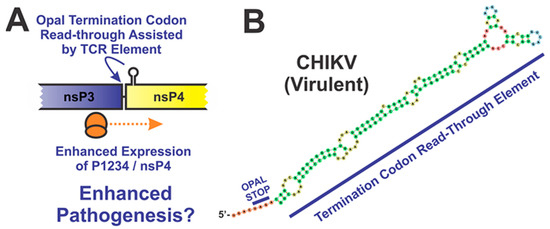 - Li, G.P.; Rice, C.M. Mutagenesis of the in-frame opal termination codon preceding nsP4 of Sindbis virus: Studies of translational readthrough and its effect on virus replication. J. Virol. 1989, 63, 1326–1337. [Google Scholar] [CrossRef]