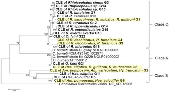 The samples that were successfully sequenced for all five loci were concatenated to produce a matrix of all the five genes. The concatenated sequences were used to construct a phylogenetic tree (Figure 4). The CLEs harbored by ticks of the genus Rhipicephalus generally clustered according to the species. However, the CLEs from Am. pomposum and Hae. aciculifer clustered together.