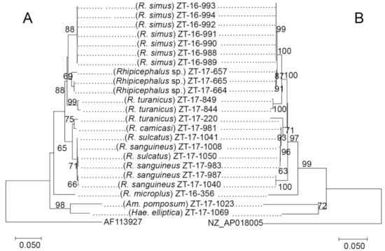 - Dantas-Torres, F.; Maia, C.; Latrofa, M.S.; Annoscia, G.; Cardoso, L.; Otranto, D. Genetic characterization of Rhipicephalus sanguineus (sensu lato) ticks from dogs in Portugal. Parasite Vectors 2017, 10, 133. [Google Scholar] [CrossRef] [Green Version]