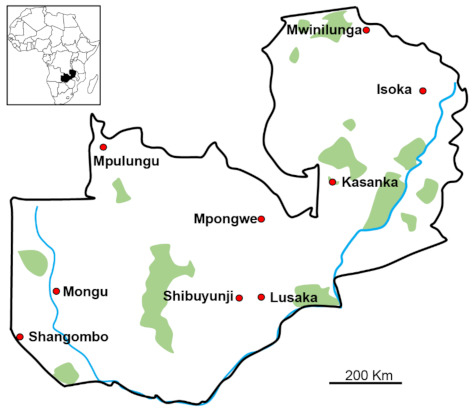 A total of 175 individuals ticks were collected from nine sampling sites in Zambia between January 2016 and December 2017 using the flannel flagging method on vegetation and picking up from the body surfaces of livestock (Figure 5). A total of 73 ticks were collected from the environment, while 71, 25, and six ticks were collected from cattle, dogs, and goats, respectively. We included only adult ticks that were apparently not engorged. The ticks were morphologically identified to the species level under a stereomicroscope using established keys [27]. Tick DNA was extracted using TRIzol Reagent (Thermo Fisher Scientific, Waltham, MA, USA) according to manufacturer’s recommendations. The concentration of the extracted DNA was measured using Qubit dsDNA BR Assay kit (Thermo Fisher Scientific). The extracted DNA was kept at −20 °C until required for use.