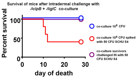 | Source of ΔclpB | % Survival after IN Inoculation with ~104 CFU | % Survival after IN Challenge with ~100 CFU SCHU S4 42 Days Later |