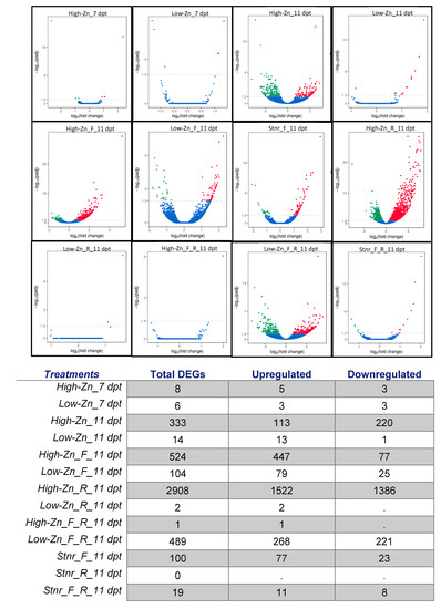 Scatter plot with differentially expressed genes (DEGs) at 7 and 11 days post-treatment (dpt), compared with non-inoculated micronutrient control (Stnr) in high-Zn (HZ) and low-Zn (LZ) treated plants inoculated with Fusarium oxysporum f. sp. niveum (F) or Meloidogyne incognita (R) or both (F_R). Red dot indicates upregulated genes while green dot indicates downregulated genes.