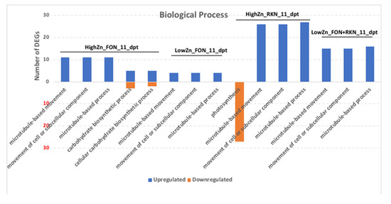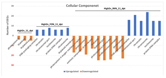 GO terms with corrected p-value less than 0.05 were considered significantly enriched by differentially expressed genes and are shown in Figure 2 (Supplementary Table S2). Significantly enriched GO terms were observed only at 11 dpt. In the biological process, movement of cell or subcellular component, microtubule-based process and microtubule-based movement were the significantly enriched terms common in high-Zn treated plants inoculated with FON alone, low-Zn treated plants inoculated with FON alone, high-Zn treated plants inoculated with RKN alone, and low-Zn treated plants inoculated with FON and RKN (Figure 2). In the cellular component, thylakoid part, thylakoid and photosystem II were significantly enriched terms in both high-Zn treated plants, with and without inoculation with RKN (alone). In high-Zn treated plants inoculated with FON alone, chromosome, chromosomal part and chromatin were the most enriched terms (Figure 3).