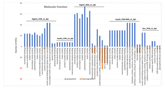 Moreover, in molecular function, exopeptidase activity was the only significantly enriched term in low-Zn treated plants (Figure 4). In high-Zn treated plants inoculated with FON alone, transcription factor activity sequence-specific DNA binding, nucleic acid binding transcription factor activity and protein dimerization activity were the most enriched terms. The most enriched term in Steiner treated plant inoculated with FON alone were transcription factor activity sequence-specific DNA binding, nucleic acid binding transcription factor activity and sequence-specific DNA binding. Similarly, tubulin binding, protein complex binding and motor activity were the most enriched terms in low-Zn treated plants inoculated with FON alone. High-Zn treated plants inoculated with RKN alone showed the most enrichment of cytoskeletal protein binding, macromolecular complex binding and protein complex binding. In low-Zn treated plants inoculated with FON and RKN, pyrophosphatase activity, nucleoside-triphosphatase activity and hydrolase activity acting on acid anhydrides in phosphorus-containing anhydrides were the most enriched terms.