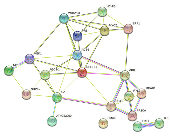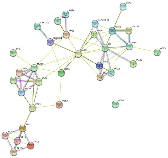 Phytohormone signaling has been shown to have a crucial regulatory role in plants [32]. Therefore, we have studied the effect of different levels of Zn on changes in the phytohormone signaling pathway. As shown in Table 3, many genes involved in the synthesis and regulation of abscisic acid, auxin, brassinosteroid, cytokinin, ethylene, jasmonic acid and salicylic acid were affected. The data indicate a synergistic regulation of these hormonal related DEGS as shown in Figure 5 through protein–protein interactome map studies using STRING database https://string-db.org/ (accessed on 16 May 2021) with Arabidopsis thaliana as the reference organism.
