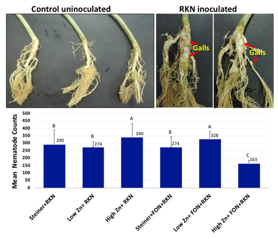 FON was re-isolated from 100% of the plants that were inoculated with FON or co-inoculated with RKN but not from non-inoculated Steiner control or plants only inoculated with RKN. Isolates were tested for FON by conventional PCR as described earlier [40]. One hundred percent of the putatively isolated FON colonies from infected plants were confirmed as FON using the PCR assay. No difference in plants being colonized by FON for all treatments and no Fusarium wilt symptoms were observed. Also, no differences in root gall formation between treatments were observed, except for a decrease in total nematode counts in plants inoculated with both FON and RKN under high zinc treatment (Figure 7). Galls were present only on plants inoculated with RKN or RKN co-inoculated with FON but were absent on non-inoculated or plants only inoculated with FON.