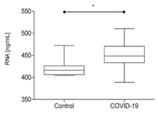 Plasma RNA concentration in the control group (N = 8) and COVID-19 patients (N = 24) (* p < 0.05).